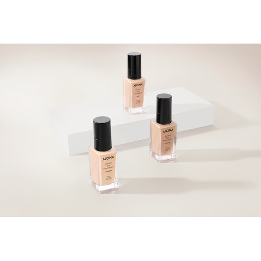 Je nach gewünschter Deckkraft mit einem Foundation Pinsel (optimalerweise mit dem Profi-Foundationpinsel), Schwämmchen oder den Fingerspitzen gleichmäßig auftragen und sanft verblenden. Für ein leichtes Finish einen Spenderhieb der Foundation auf den Profi Foundationpinsel auftragen, dann auf die Wangen, Stirn und Kinn das Make-up auftupfen und mit ihm gleichmäßig verteilen – für mehr Abdeckung gezielt nacharbeiten und sanft einarbeiten, ohne die Natürlichkeit zu verlieren.